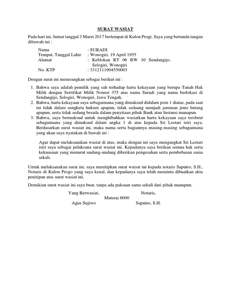 Tanda tangan yang menyatakan bahwa surat wasiat itu dibuat atas sepengetahuan dari ahli waris yang berhak Tanda tangan dari saksi-saksi yang menghadiri penulisan wasiat itu Tempat dan. Contoh Surat Wasiat Pengangkatan Waris Surat wasiat pengangkatan waris merupakan surat yang ditujukan. 7 contoh surat pribadi untuk orangtua 1.